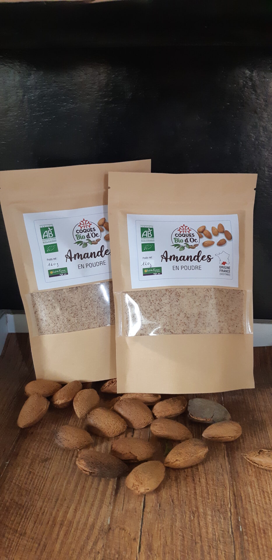 Sachet d'amandes en poudre BIO. Cultivées dans le Tarn à Cambounet.