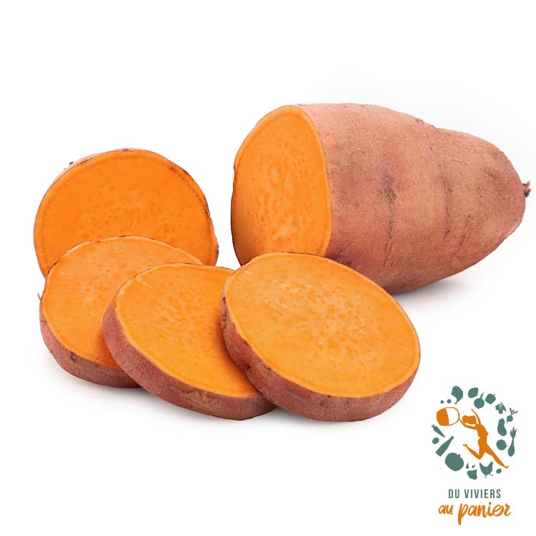Patate douce, variété Bellevue, chair orange saveur sucrée. Ne pas mettre dans votre frigo, produit fragile. En vapeur, sauté, frite, purée.....une patate!